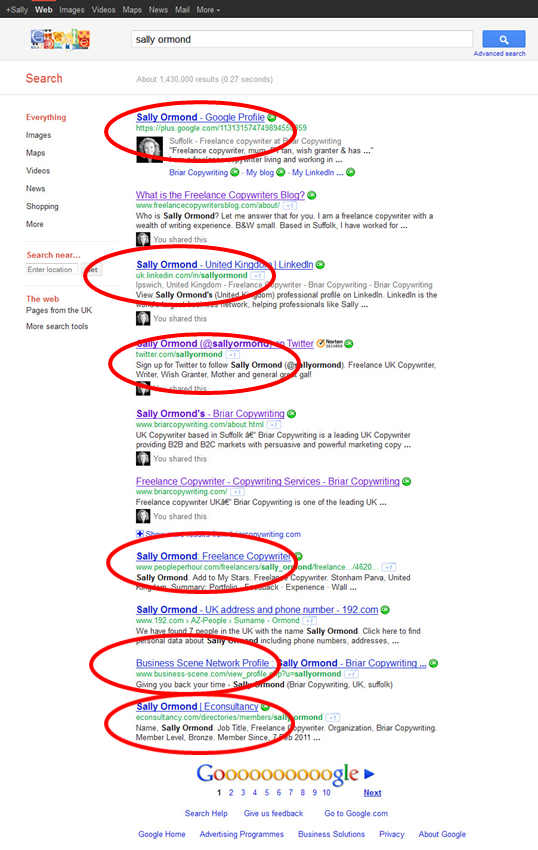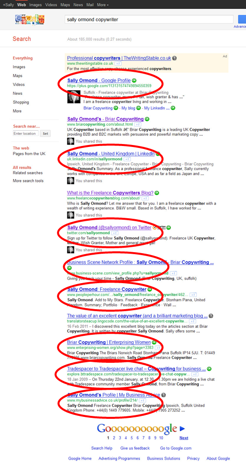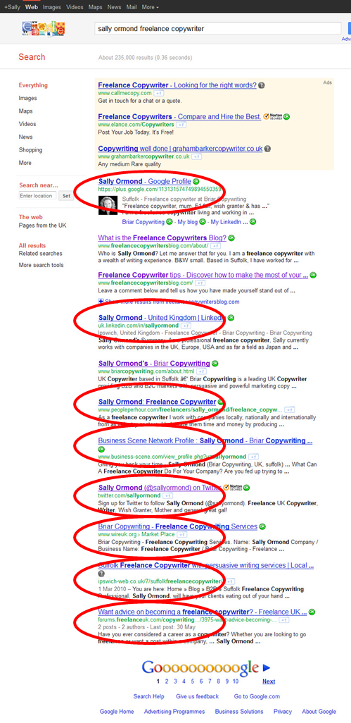 So what if I amended my search to ‘Sally Ormond Copywriter’ or ‘Sally Ormond freelance copywriter’?