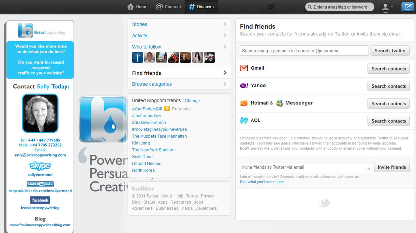 At the top of the screen you can see #Discover, clicking on this brings up this screen. As you can see, it gives you the options ‘who to follow’ and ‘find friends’.